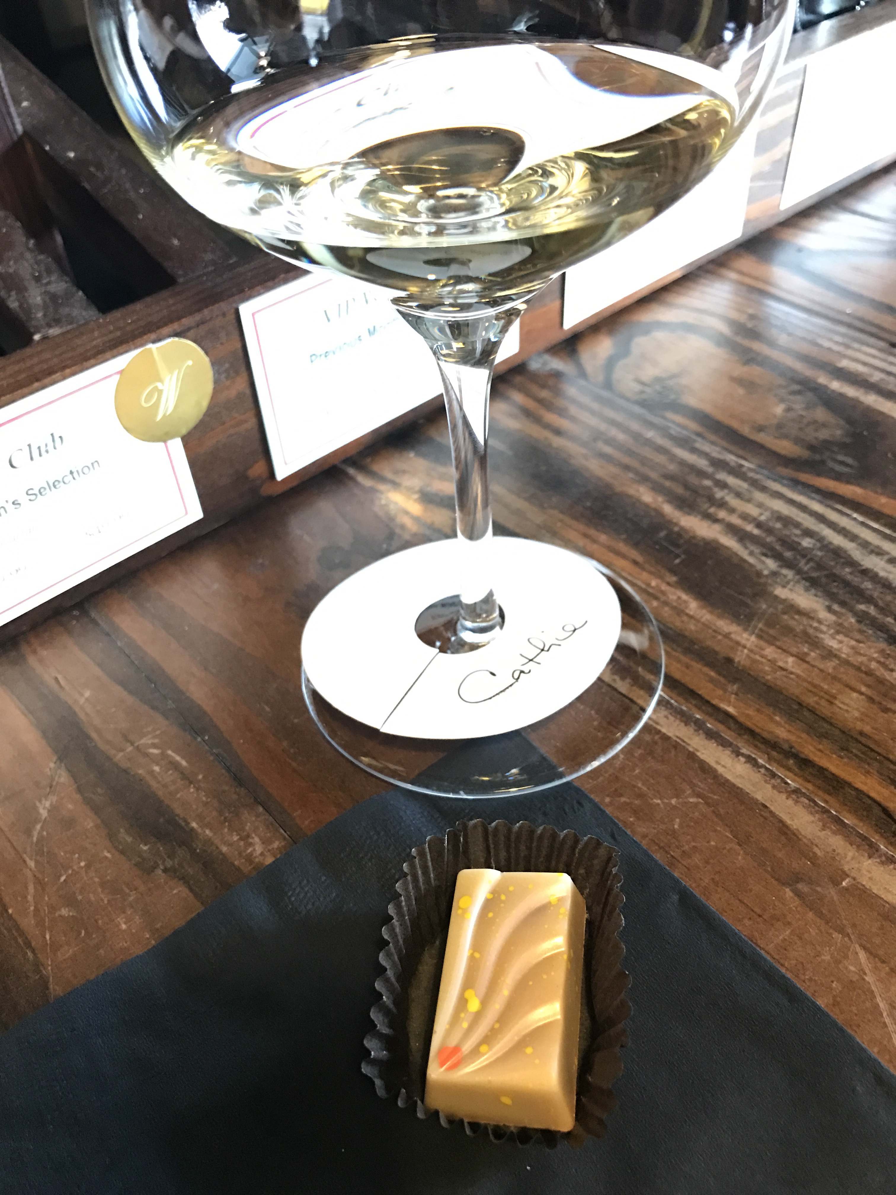 The chocolate for this wine: Mandarin and organic honey milk chocolate ganache, blood orange olive oil, white chocolate shell.