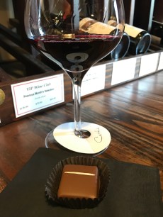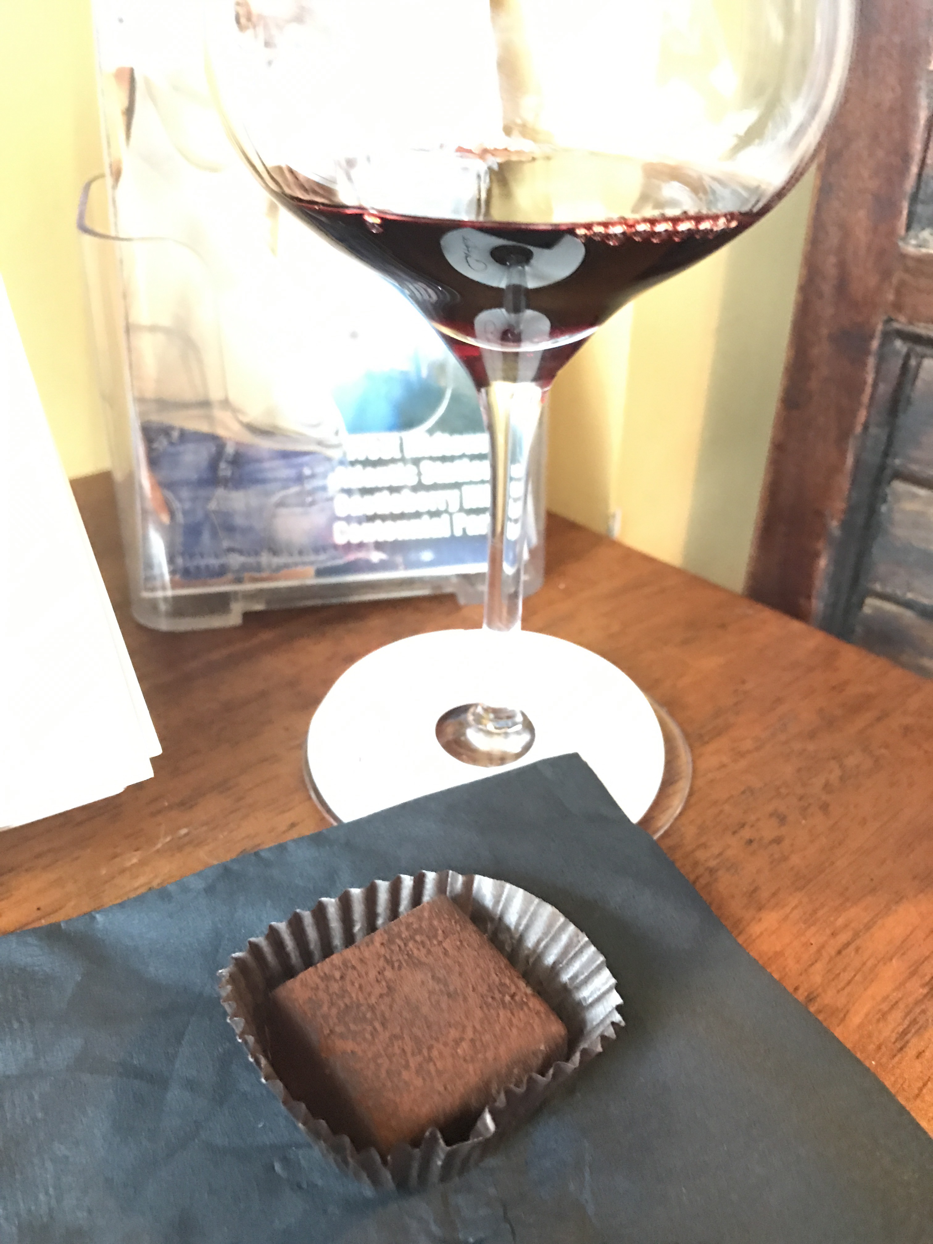 The chocolate for this wine: tart cherry chocolate ganache with wild mushroom olive oil in dark chocolate.