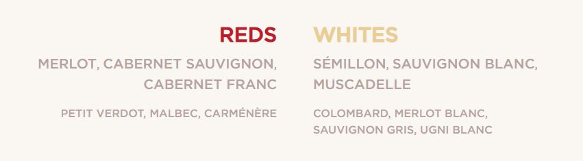 Bordeaux wine is always a blend, with specific grapes, as noted below. The Left Bank wines are traditionally Cabernet Sauvignon dominant from gravelly soils, while the Right Bank wines will be Merlot or possibly Cabernet Franc dominant, from limestone and clay soils. Of the red varietals planted in the region, Merlot represents 66% of the vines. Cabernet Sauvignon accounts for only 22.5%, with the other blending grapes having an even smaller presence – Cabernet Franc 9.5%, and the remaining varieties representing only 2% of vines. For the white wines Sauvignon Blanc and Semillon are nearly equal in plantings and represent 88% of the white grapes grown.