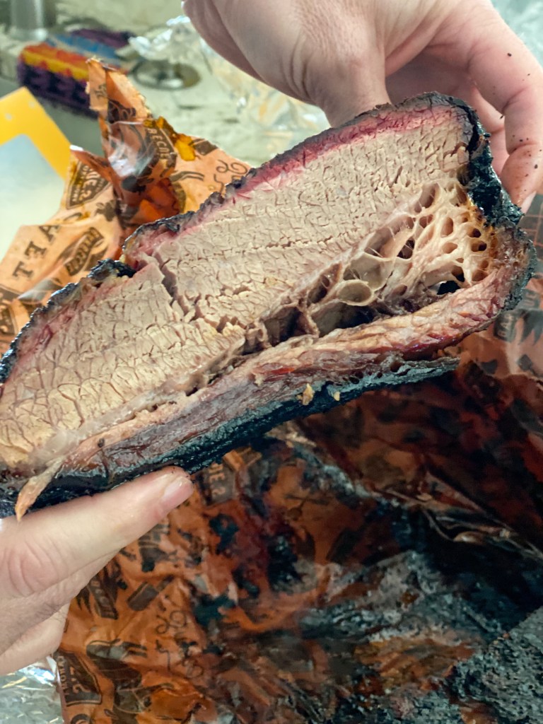 Of, enough geeking out about wine, let’s talk about this amazing brisket my husband smoked. He put this baby on the smoker at midnight on Friday and pulled it off around 3:00 p.m. on Saturday afternoon. We had invited a few friends over for dinner on Saturday to help devour the deliciousness, The good news is the brisket was amazing, the bad news is I didn’t get very good pictures of the Ridge Petite Sirah we had with it because we were too busy enjoying it! Que Sirah Syrah.