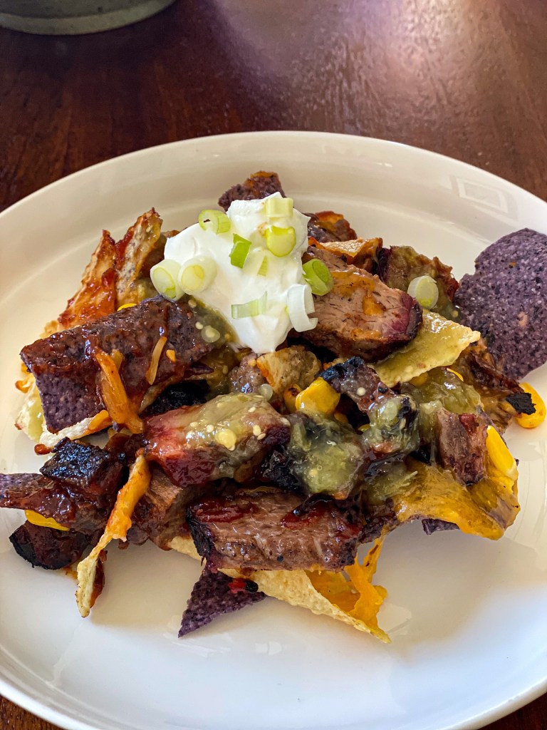 The brisket nachos were a great pairing with this wine. I used a salsa verde as I just didn’t think regular tomato salsa would go well with the BBQ sauce and brisket, or the wine. It was layers of chips, cheese, BBQ sauce, salsa verde, a dab of sour cream with green onions sprinkled on top. So simple but absolutely delicious.