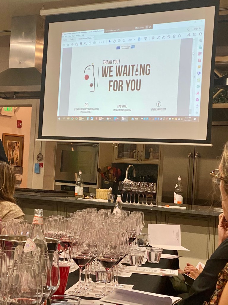 The wines ranged in age from 2020 to 2013 and the older ones were definitely more complex, as well as elegant. Xinomavro wines have superior aging potential according to the winemakers. As stated above the range of aromas and flavors was astounding. My notes include: smokiness, minerality, vegetal, kalamata olive, cherry, strawberry, fig, milk chocolate, dark chocolate, iron, woodsy, floral.