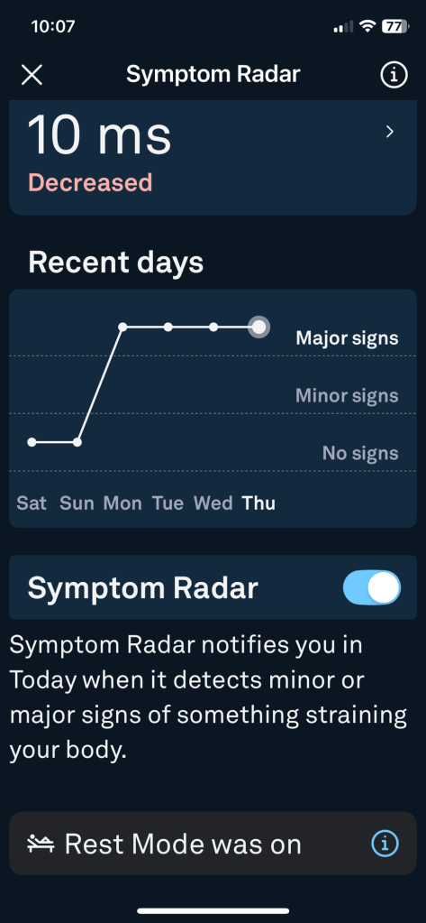 I took another flu/Covid test late Thursday afternoon and it was again negative! The only area of concern was that my Oura ring was still telling me that my body had major symptoms of fighting something off. This continued, with one day of minor signs, through Sunday. On Monday, one full week after it picked up symptoms, it returned to normal.