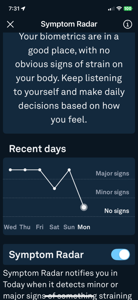 On Monday, my Oura ring told me I had major symptoms but I still felt fine and my temp was 99, which doesn’t event count right? My flu/Covid test was negative. Nevertheless, I cancelled a few appointments that I had scheduled.