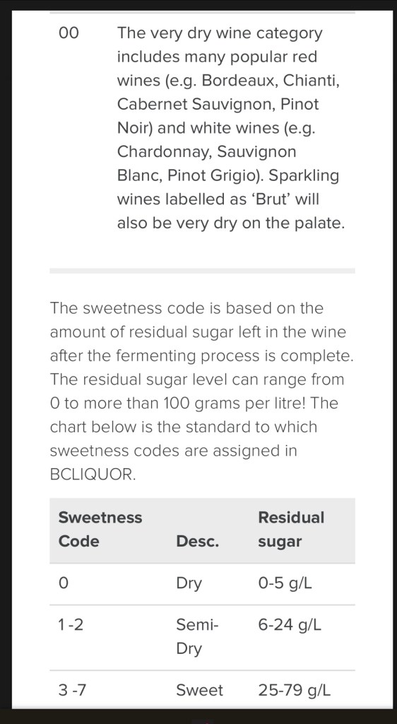 Equally fascinating was the British Columbia Liquor Board’s wine sweetness scale. It goes from 00 to 7, and I am not fully understanding the 00 category.