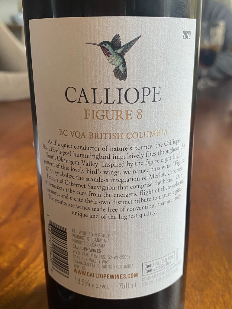 The Calliope line includes a red and white wine called Figure 8, after the hummingbird’s wing pattern. The white wine is an intriguing blend of Pinot Gris, Chardonnay, Gewürztraminer, Viognier and Sauvignon Blanc. This red one is Merlot, Cabernet Franc, Cabernet Sauvignon, Malbec and Syrah. In addition there is a full line of individual white varietals, and a rose.
